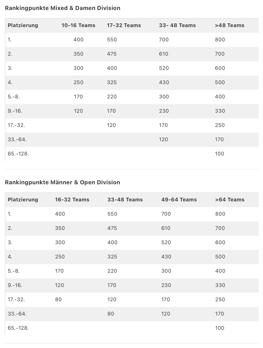 How does the ranking work?The ranking is based on a number of points that each team or player receives for their performance in a tournament depending on their ranking. Only tournaments that are officially registered with us as Tour Stop will be included in the ranking. The number of points depends on the size of the underlying tournament. Team rankings are calculated for the different divisions men, women and mixed as well as the individual ranking for women and men. The individual points can be collected in pure men's or women's tournaments as well as in mixed tournaments. Within a tournament, in order to meet all playing levels, several performance classes, e.g. advanced and beginner, can be offered. We also encourage you to offer separate tournaments for beginners. These tournaments are also part of the GRT, but only give a symbolic number of ranking points for the winners. As a symbolic value there are 20 points for the 1st place in a beginner tournament, 10 points for the 2nd place and 5 points for the 3rd place in the ranking. After the tournament host has reported the tournament results, they will be checked by us and released in the system. Our platform then updates the ranking points of the individual scores automatically. No system is perfect: If you have any mistakes concerning your ranking or points, please contact us at contact@roundnetgermany.de.